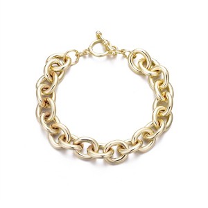 This chunky gold plated bracelet features oversized oval links and a classic toggle clasp. Its bold and sturdy but still feels smooth and comfortable on the wrist. A statement piece thats easy to wear and pairs well with everything from jeans to dresses.