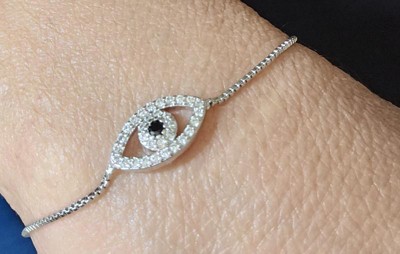 [This review was collected as part of a promotion.] Cutie evil eye bracelet. Came as pictured. Super bright silver color!