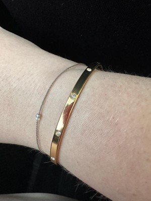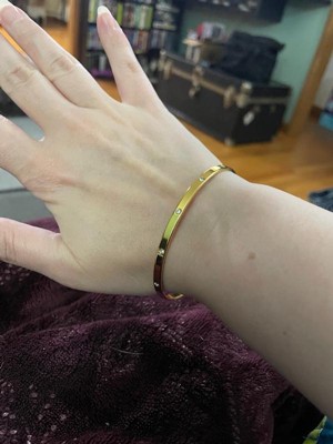 [This review was collected as part of a promotion.] I am obsessed with this gold bangle! It matches perfectly with my other gold jewelry. I have very tiny wrists and it does not feel like it is going to fall off. The quality is great and I love that their company is female owned!