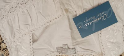 • Double layered back yoke above cotton lace trim and gathered back. Dress flows into a slight A-line shape with lace above a wide ruffled, cotton lace trimmed hem. Beautiful.