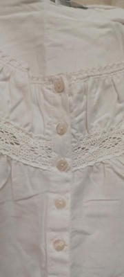 • Gathered, double layered front yoke above 1.25 inch cotton lace trim and narrow front placket with 8 pearl shell buttons.