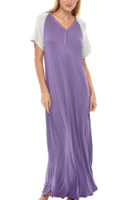 This sleeping shirt for women features a v neck with button down front, curved hem, casual style, frilled sleeves and mid-thigh length. This dress style nightshirt for women is great for nursing, breastfeeding or simply as a comfortable casual t-shirt. Loose fit with stretch makes it great as sleepwear but casual enough to be worn outside.