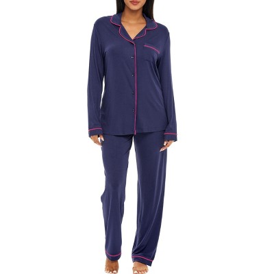 Butter soft knit fabric that you'll absolutely fall in love with as we have! This short sleeved pajama top features a rounded collar, full button down front, patch pocket on upper left front panel and contrast piping throughout. The pajama bottoms feature an elastic waist for a comfortable fit and hidden in-seam pockets deep enough for your smart phone.