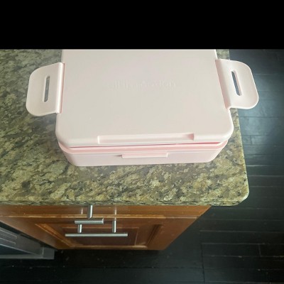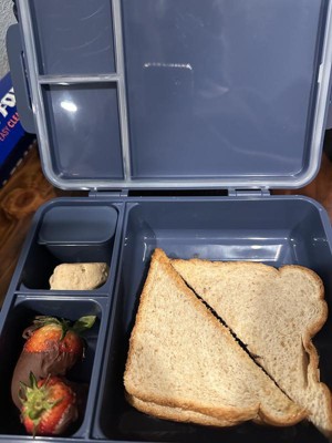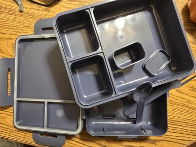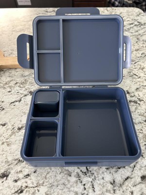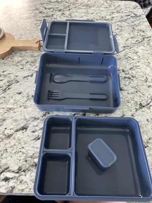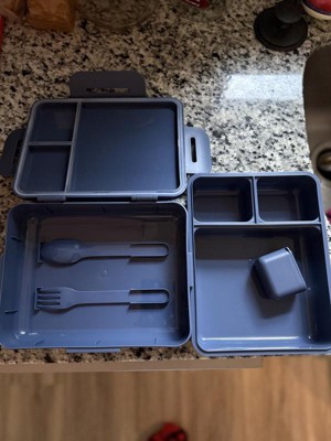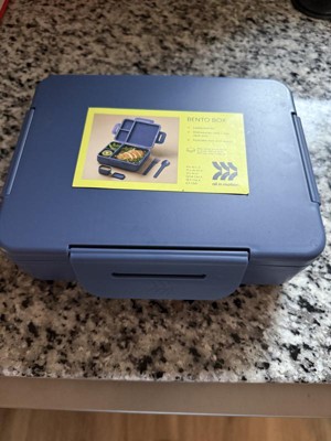 I absolutely love the All in motion adult blue Bento box. It is absolutely perfect for me to take my lunches to work and or wherever I am going for the day. It has different compartments which is my favorite part so that it separates the food items I have. It latches really well so that it’s spill proof. You can take out the tray once you open it so that you reveal the silverware underneath. It’s extremely helpful and very sturdy.