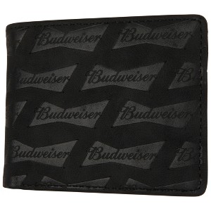 Officially licensed Budweiser Black Bifold Wallet AOP Bowtie Deboss with ID Window. This black "Budweiser" Bifold Wallet is made from faux leather and features a classic debossed "Budweiser" Bowtie logo printed all over the exterior, interior pockets, and ID window.