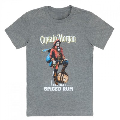 Men's grey Captain Morgan t-shirt. Made from a cotton/poly blend, this tee features an "Original Spiced Rum" logo on the front. Officially licensed.