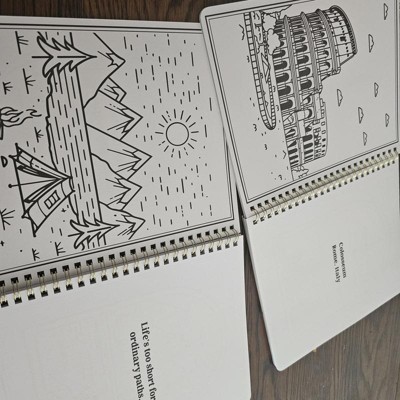 [This review was collected as part of a promotion.] I was surprised at the size as they aren’t traditional size coloring books, but the surprise was nice! The slightly compact size will fit nicely in my work tote. The spiral bound is ideal as the pages lay flat making folding it in half easy. Perfect for travel and use in small places like airplane tables. I do wish that the images were slightly more detailed. They are all quite simple, however the inspirational saying and names of the scene are nice. I received an incentive to write this review.