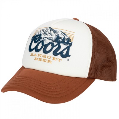 Officially licensed Coors Banquet Vintage Logo Trucker Hat. This brown and white "Coors Banquet" Trucker Hat is made from foam and features the vintage "Coors Banquet" logo on the front with a rounded bill and adjustable snapback.