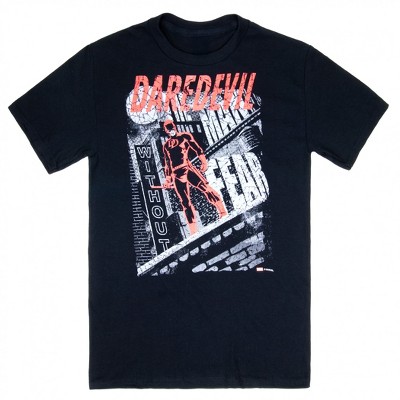 Keep it classic and brooding with this officially licensed Daredevil Man Without Fear Black T-Shirt. This Marvel t-shirt is made from cotton and features the fearless vigilante poised for justice in striking red against black.