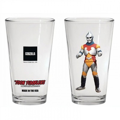 Officially licensed Godzilla Destroy All Monsters Pint Glass. This clear pint glass displays colorful poster art from "Godzilla: Destroy All Monsters" with iconic monster lineup.