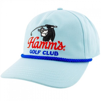 Officially licensed Hamm's Beer Bear Patch Trucker Hat. Features a "Hamm's Beer Bear" patch on a light blue mesh trucker hat. Made from polyester with an adjustable snapback.