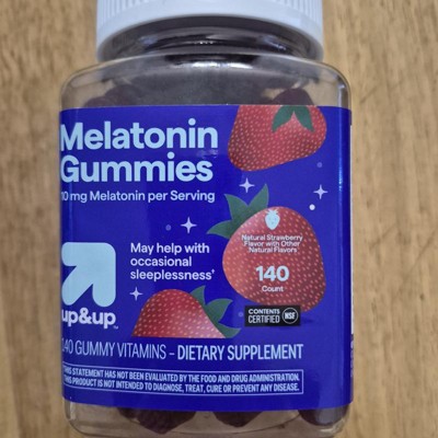 Enjoy more restful, consistent sleep with the help of these Adult Melatonin 10-Milligram Gummies from up&up™. These gummies contain 10 milligrams each of melatonin, which may help with occasional sleeplessness. Intended for adult use only, the gummies have a natural strawberry flavor with other natural flavors, and there are 140 gummies to each pack.