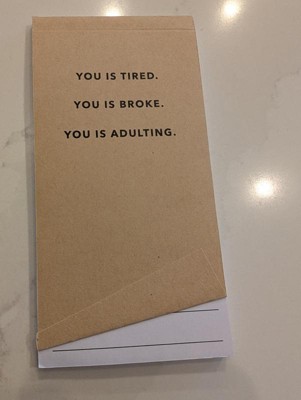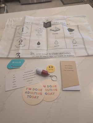 Cute little kit with a bunch of stuff. A coin toss for when you are not sure if you want to go out. Laundry bag that tells you how to sort and wash. Two coasters that say "I'm done adulting today" also a letter opener and notepad. Fun little things.