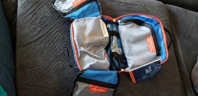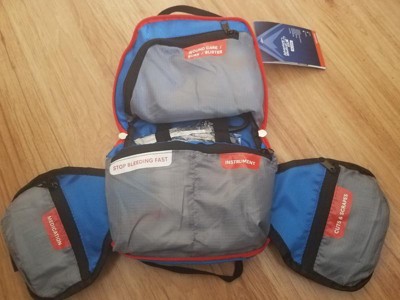 [This review was collected as part of a promotion.] This first aid kit is very nicely laid out. I like how the pouched fold out for easy access and are labeled so clearly with type of injury the contents address. The carry bag itself is lightweight and fits into a backpack without taking up too much room. There is sufficient room to add an epi pen, small eye wash bottle, and extra bandages. I seem to always forget safety pins when I pack my own kit, but this one has them. I'm very happy to have this first aid kit for unexpected mishaps while away from home.