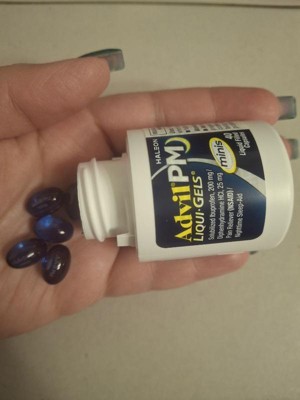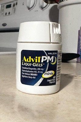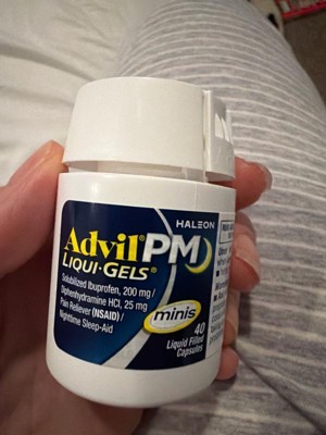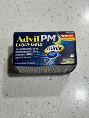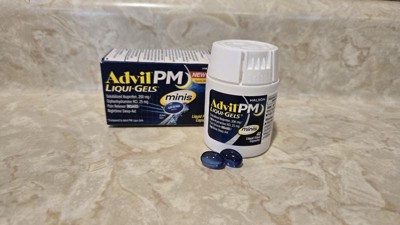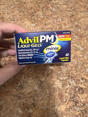 Advil PM Liqui-Gels Minis deliver powerful relief in a smaller, easier-to-swallow capsule. Each liquid-filled mini capsule combines the trusted pain-relieving strength of Advil with a gentle sleep aid, helping you get the restful sleep you need. Featuring solubilized ibuprofen (200 mg) and diphenhydramine HCl (25 mg), this dual-action formula soothes nighttime aches and pains while helping you drift off to sleep faster. Perfect for those who want the same strength in a more convenient size.