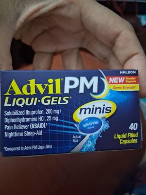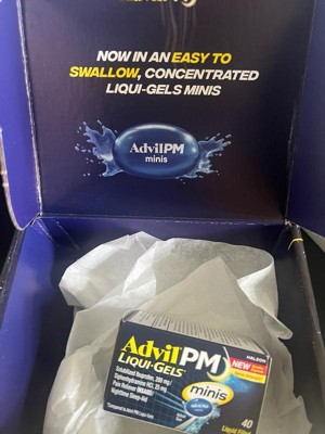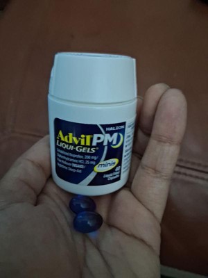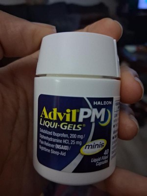 Advil PM Liqui-Gels Minis deliver powerful relief in a smaller, easier-to-swallow capsule. Each liquid-filled mini capsule combines the trusted pain-relieving strength of Advil with a gentle sleep aid, helping you get the restful sleep you need. Featuring solubilized ibuprofen (200 mg) and diphenhydramine HCl (25 mg), this dual-action formula soothes nighttime aches and pains while helping you drift off to sleep faster. Perfect for those who want the same strength in a more convenient size.
