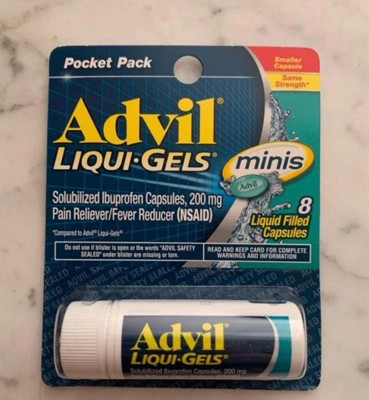 - 8 Advil Liqui-Gels minis Pain Reliever and Fever Reducer liquid filled capsules, ibuprofen 200 mg