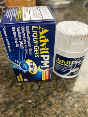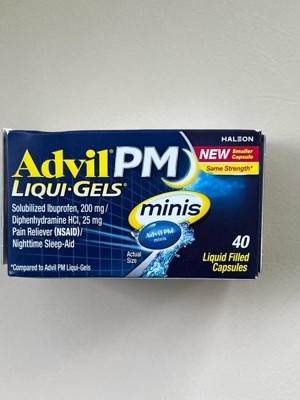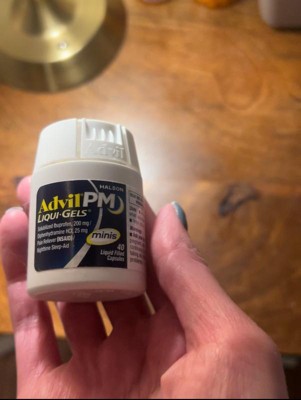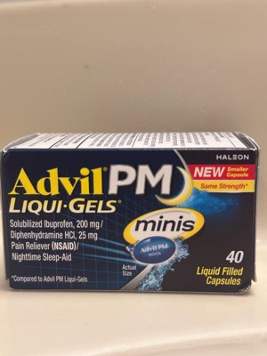 [This review was collected as part of a promotion.] Received my Advil PM, which has helped me a lot with minor aches and has helped me stay asleep. They are minis so it's been easy to take them. 40 capsules in a bottle are so convenient to have especially when traveling