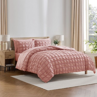 AENKYO Floral Print Comforter Bedding Set 3-Piece King/Cal King Reversible Floral Botanical Seersucker Comforter Set,Pink