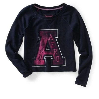 Opt for a sporty yet trendy look with the Aeropostale Women's Athletic Cropped Knit Sweater. This long-sleeved knit sweater, with its material unknown, is comfortable and perfect for any athletic occasion.
