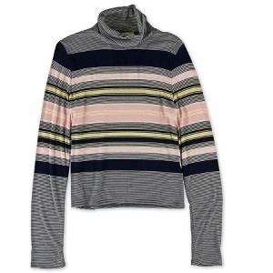 The Aeropostale Women's Striped Turtleneck Pullover Sweater from the Prince & Fox line brings a modern touch to a classic design. Made of a stretchy rayon-spandex blend, this medium-weight sweater is perfect for a casual outing or lounging at home. The turtleneck, long sleeves, and straight hem provide a snug fit while the multi-patterned, multi-colored stripes add a playful touch to any outfit.