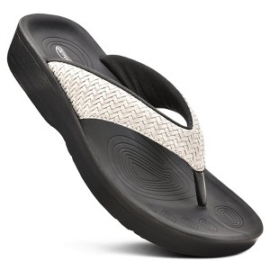 These are comfortable with decent arch support and a heel cup. They are dressier than basic flipflops so nice for summer wear and comfortable between the toes. They have a nice fuzzy liner on straps so I wouldn't recommend for the pool, getting wet. They are Euro sized on their base but aren't letting us select that-- and I found the Dune (this style) is sized larger than the Fallon and Meira with a 8 being a 39EU and 9 a 40EU-- (which doesn't match the size chart attached saying 8=38, 9=39). I normally wear an 8-8.5 and often size up for toe room but Meira fit me in 8 (EU39). HOWEVER, for Fallon and Miera, I fit in a 9 since that was labeled 39EU on the base (so per the size chart, in general, Aerothotics run smaller). The straps are snug but comfy on my feet and it seemed like I could wear the width in 38, 39, or 40 -so didn't see a lot of change in width per size. I docked one star for sizing issue. NOTE: AERO and TARGET should switch sizing selection on this brand to EU numbers since they aren't exactly a whole size different, and this is clearly labeled differently, even on the box! (see title)