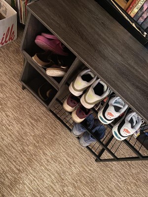 Effortlessly organize your shoes with our Afton 3 Tier Shoe Rack Storage Organizer, featuring three shelves and two bins, offering space for shoe organizers and other entryway essentials. The weathered woodgrain and black metal frame lend charm to your space, while the shoe rack storage organizer sturdy construction and wall-anchoring capability ensure stability. With a capacity of 6-9 pairs, our shoe tower is ideal for tidying up your entryway. The open bins can accommodate shoe boxes, handbags, and more, while the shelves provide a dedicated shoe rack for your footwear collection. Whether you need a shoe stacker for your entryway or a shoe box organizer for your essentials, our piece offers space and a sleek, modern design. Our tall shoe rack organizer not only provides practical storage but also serves as a stylish shoe display case. The contemporary feel will work with various decor styles, while the open design allows you to showcase your favorite shoes.