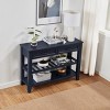 【Versatile Surface】. The 42" wide tabletop offers a generous surface for displaying decorative items, vases, or lamps, while the open shelf design below adds a practical touch for additional storage solutions.