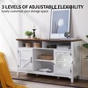 - 【Timeless Farmhouse Elegance】:Measuring 58" L x 15.7" W x 33.9" H, this farmhouse buffet cabinet features a rustic antique white finish with walnut wood grain accents. The classic iron-tone metal hardware and hinged barn doors give it a charming, rustic appeal that enhances any living room, dining room, or entryway décor.