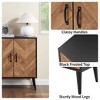 【Elegant Herringbone Design】:Featuring a modern, rustic style with a unique herringbone wood grain pattern, this cabinet adds a touch of sophistication to your space. The combination of dark and light wood tones, along with the black panel accents, complements any décor, enhancing the beauty of your home.