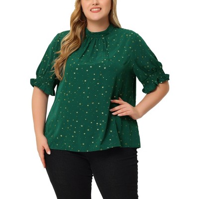 Introducing the Women's Pleated Keyhole Back Star Print Puff Sleeve Mock Neck Top, the perfect addition to your summer wardrobe. Made of comfortable, quality materials, this summer top is stylish and comfortable to wear. The star print adds a trendy and playful touch to this elegant blouse, making it suitable for casual and dressy occasions. The pleated detailing on the front adds texture and dimension, creating a flattering silhouette. The keyhole back adds fashion, while the mock neck adds a sophisticated and modern twist. This versatile top can be paired with jeans or skirts for a casual look or dressed with a dress, pants, or a skirt for a more formal event. Whether going out for a night on the town or attending a business meeting, this top will ensure you look stylish and put-together.