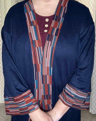 [This review was collected as part of a promotion.] This long cardigan sweater is a size 1x, which is the size I normally wear, and it fit true to size. This sweater is a thinner material which is meant to be worn open. The sleeves fell a little below mid forearm and were not fitted to the arm. I liked the color detail around the front edge and thought this sweater was comfortable. I received an incentive to write this review.