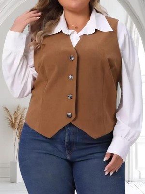 Women's Plus Size Corduroy Button Down V-neck Sleeveless Waistcoat Business Casual Vest - Agnes Orinda 1X Brown