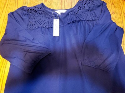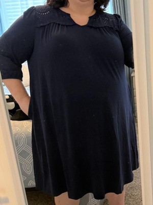 Women's Plus Size Eyelet Hollow Out Pleat Notched Neck 3/4 Sleeve Casual Midi Dress with Pockets - Agnes Orinda 1X Dark Blue