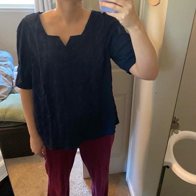 • This top features short sleeves with a pleated design, a notched v-neck, a stretchy, regular fit, and a solid color design