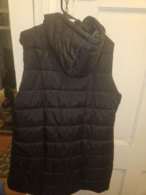 Features: Women's long puffer vest, two side pockets, full zipper, hood, buttons on the side as decoration, sleeveless, plus size vest