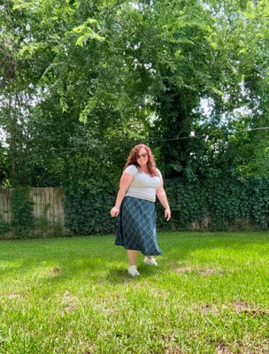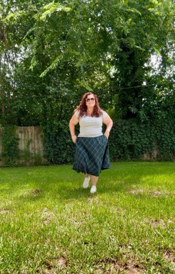 [This review was collected as part of a promotion.] Super cute, love the pockets. I’m 5’3 and it hits me perfectly for a midi skirt. Fit is true to size, and it has an elastic waist which is perfect for us curvy girls. The only thing I don’t love is that the fabric that touches your legs is a little scratchy.