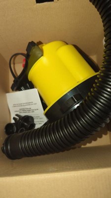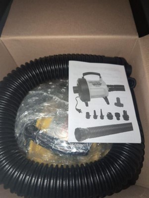 The 120-volt Super Pump for inflatables has an accordion-style hose that locks onto the pump and valve fittings, eliminating annoying disconnections. This boat towables pump inflates and deflates everything from 5-person tubes to beach toys. With five universal valve adapters, this pump equips you to fit all popular valves. For added convenience, there’s a carry handle and a 10-foot power cord. It has a volume of 300 liters per minute with a maximum pressure of 3 psi. It draws 7.1 amps (917 watts). This is one of the best air pumps for towable tubes on the market!