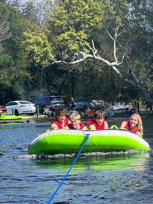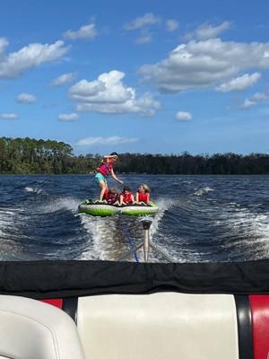 [This review was collected as part of a promotion.] This one it's a must have for summer this airhead g- force 4 Rider Towable tube it's amazing we had a amazing time,me my sister and my mother in law were on the slide and wow we enjoy the view of this beautiful water , we ha a amazing time. I can't do to much because I'm pregnant but this one it more chilled mode you seat and enjoy your view. It's easy to inflate, and it's very large and perfect for 4 peopleI. love and of course it's a 10/10 recommend it.