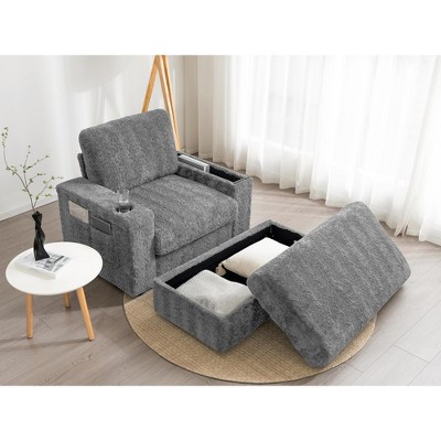 Airsurfer 42" Oversized Faux Rabbit Fur Chaise Lounge with Storage Ottoman,Cup Holders & Hidden Armrest Storage,Convertible Sofa for Living Room,Gray