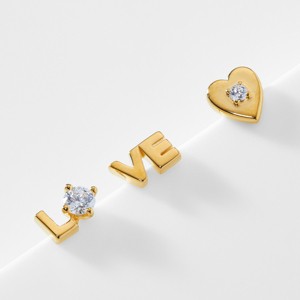 >This set of 3 single stud earrings is designed to make a sweet statement with your ear stack, spelling out "LO-VE", punctuated by a simple heart stud with CZ accent.