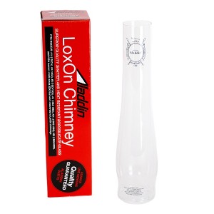 The Aladdin Lox-On Chimney is a replacement glass chimney designed specifically for various Aladdin lamp models that use the Lox-On burner system. The Lox-On chimney fits burner models 12, 21, 21c, A, B, C, 23, which were made from 1950's until the end of the 20th century. Base of chimney has small bumps that engage with tabs on burner top. Aladdin's exclusive borosilicate glass is shatter resistant and can withstand immense heat. All chimneys carefully inspected and are free of bubbles and other defects. It's the finest lamp chimney available, made from the same kind of glass they use in laboratories! 12-1/2"H, 2-5/8"OD base. How to Install: Set chimney into gallery, then twist gently to lock into place.Caution: If overtightened, chimney will break in use.