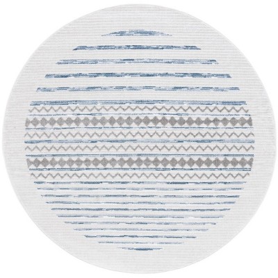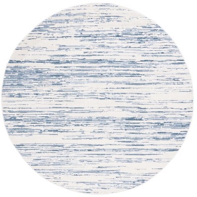 Wrapped in a harmonious blend of blue and ivory hues, the rug's solid-style exudes contemporary elegance. Its intricate pattern adds a subtle allure that complements any decor. The round shape provides a unique alternative to traditional rectangular rugs, perfect for creating a focal point in any room.