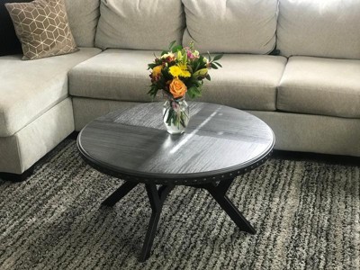 This table looks great in my living room. It's the perfect shade of medium to dark grey. The metal accent around the edge is a nice addition. It was so easy to put together as well.