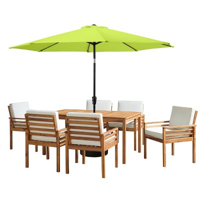 Enjoy hosting your friends and family around this solid acacia wood 6-piece outdoor dining set. Featuring acacia wood frames with plush water-resistant ivory chair cushions for a natural look that will brighten up your space with its simplicity. Up to four people can be seated comfortably around this table. The durable acacia wood design is resistant to outdoor elements so you can enjoy entertaining with this set for seasons to come. The set also includes a 10-foot rectangular umbrella. The sun umbrella outdoor patio shade is an attractive piece of outdoor décor that provides quality sun protection whether you’re entertaining guests on the deck or lounging by your swimming pool.