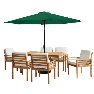 Enjoy hosting your friends and family around this solid acacia wood 8-piece outdoor dining set. Featuring acacia wood frames with plush water-resistant ivory chair cushions for a natural look that will brighten up your space with its simplicity. Up to six people can be seated comfortably around this table. The durable acacia wood design is resistant to outdoor elements so you can enjoy entertaining with this set for seasons to come. The set also includes a 10-foot rectangular umbrella. The sun umbrella outdoor patio shade is an attractive piece of outdoor décor that provides quality sun protection whether you’re entertaining guests on the deck or lounging by your swimming pool.