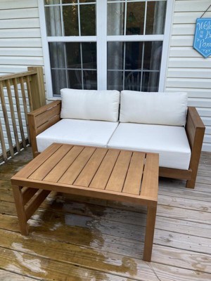 [This review was collected as part of a promotion.] The coffee table and loveseat create a minimalist modern look that creates an inviting space on my patio. The set is made from eucalyptus wood, and the furniture not only looks fantastic on my deck but is incredibly sturdy and durable. I am confident that this set will withstand the test of time and maintain its stunning appearance. The cushions on the couch are made with thoughtful touches as well as being extremely comfortable. The zippered cushion covers are easy to remove and clean. Additionally, the coffee table is a great height for placing drinks while lounging on the couch or tending to the grill. I recommend this set as its beauty, comfort, and quality make it the perfect addition to any outdoor space.