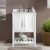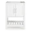 Enhance your bathroom or powder room space with this freestanding vanity base cabinet that has a classic look as well as ample storage space. Made from solid pine wood and composite wood, the base features two paneled shaker doors with sleek nickel handles that allows you to store cleaning supplies and other bathroom essentials. An open, slatted bottom shelf offers additional room for bath towels or accessories. The clean white finish complements a wide range of decors. Vanity top and sink are not included.