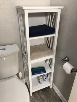 Bring style and organization to your bathroom. This collection works in a range of decorating styles- from traditional to modern with its clean lines and decorative side-element. Wood construction with a white, painted finish, these pieces are designed to create and maximize bathroom storage. The clean-lined frame designed with four open shelves offers plenty of space to keep anything from towels to toiletries. Vertical design fits anywhere in your bathroom and keeps your bathroom must-haves neatly stored and easily accessible. Bath collection is moisture resistant.