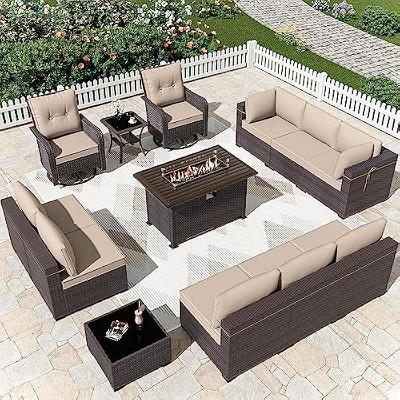 ALAULM 10 Pieces Patio Furniture Set, Rattan Wicker Outdoor Conversation Sets w/43"Propane Fire Pit Table, Swivel Rocking Chairs w/4"Cushion, Blue